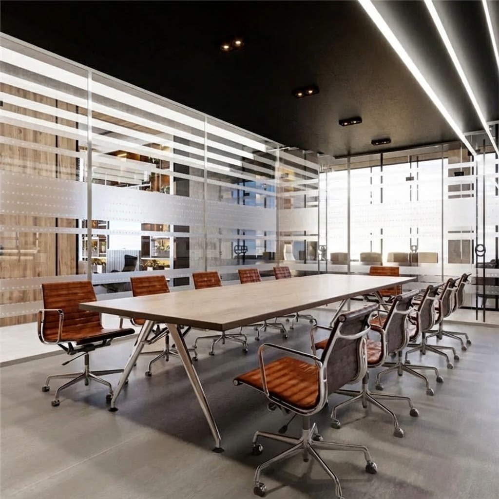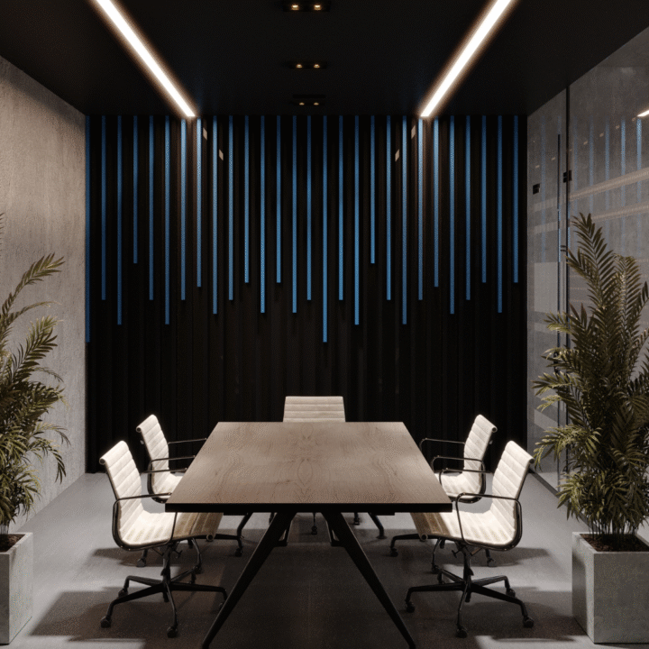 High–quality materials were also carefully selected to enhance the sense of luxury, including concrete flooring and walls finished with specialty paints. The furniture and decor colors were coordinated according to the company’s brand palette, reinforcing the brand identity throughout the space.