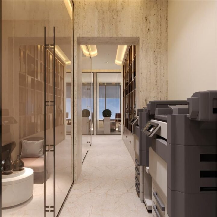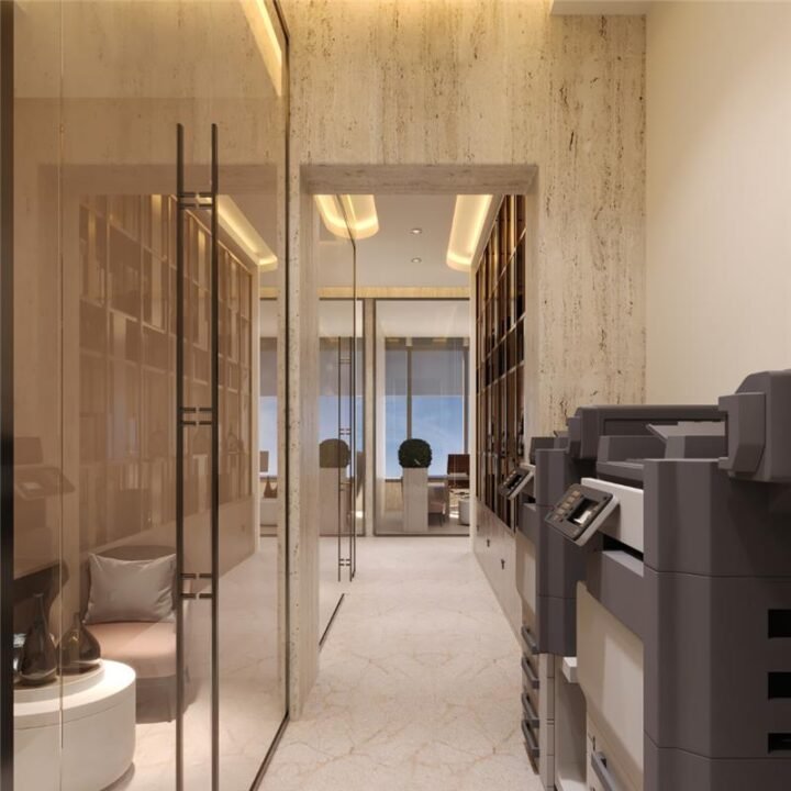يضم المشروع مجموعة من المساحات الفاخرة والمتكاملة، بدءًا من منطقة الاستراحة للزوار، مرورًا بمكتب الاستقبال الطويل المغطى بالرخام الأسود الذي يعزز شعور الفخامة، وصولًا إلى صالة كبار الشخصيات المخصصة للضيوف والموظفين. وينتهي التخطيط بمكاتب المدير التنفيذي، المصممة بأعلى درجات الاهتمام بالتفاصيل والدقة.