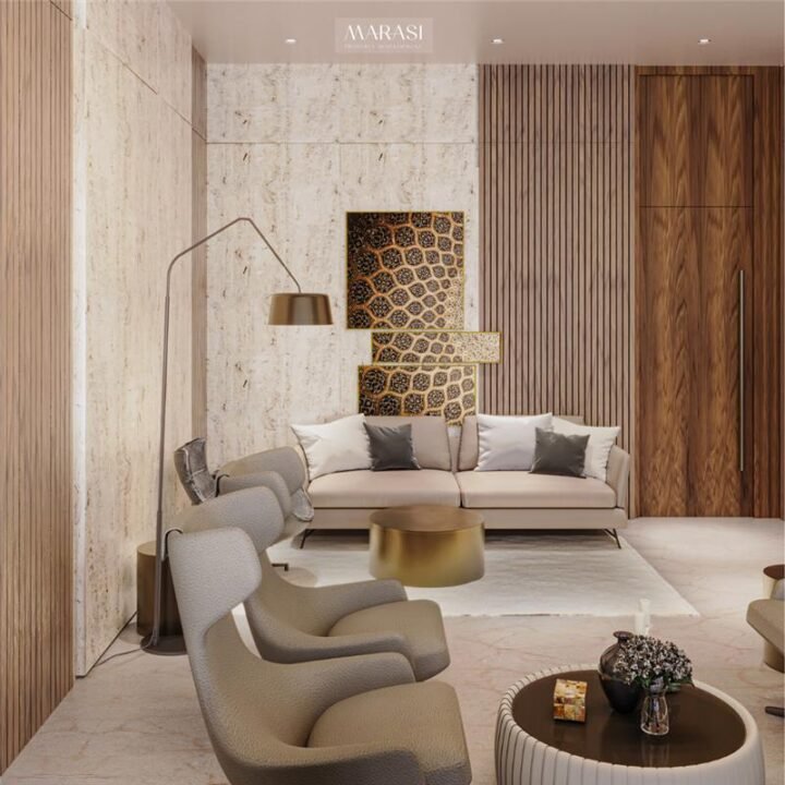تم اختيار مواد التأثيث بعناية لتكون مريحة بصريًا ومتناسقة تمامًا مع التصميم الداخلي، مكملةً للفخامة العامة دون التأثير على التفاصيل الراقية.