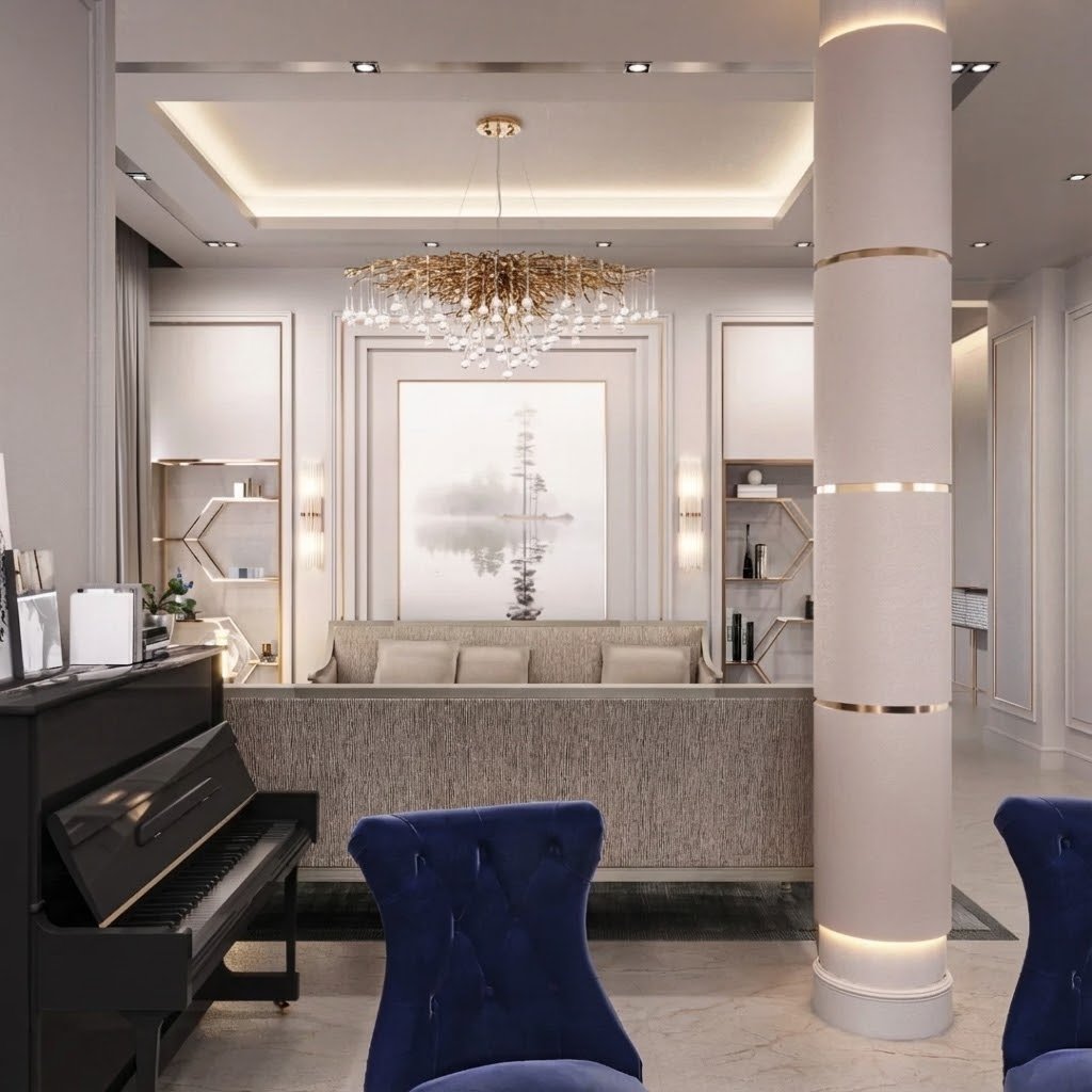 The entrance welcomes guests with an inviting sense of grandeur, leading into a spacious living area that combines aesthetic beauty with everyday comfort. The soft palette of earthy shades, marble finishes, and custom-designed furniture creates a serene environment, ideal for both relaxation and entertaining.